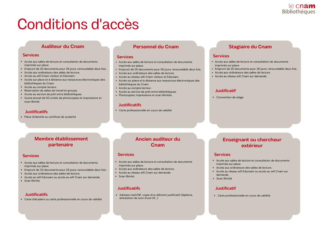 Les bibliothèques et centres de documentation du Cnam sont désormais accessibles aux anciens auditeurs du Cnam et aux enseignants et chercheurs des universités et des établissements d'enseignement secondaire, supérieur ou de recherche public français ou étrangers.